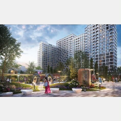 Закрытая территория жилого комплекса, продуманное благоустройство, эксплуатируемые кровли стилобата, образовательный центр с детским садом создают приватное пространство для тихой семейной жизни, а городская площадь с фонтанами, ресторан, супермаркет, коммерческая инфраструктура на первых этажах привносят созвучную с ритмом города динамику.